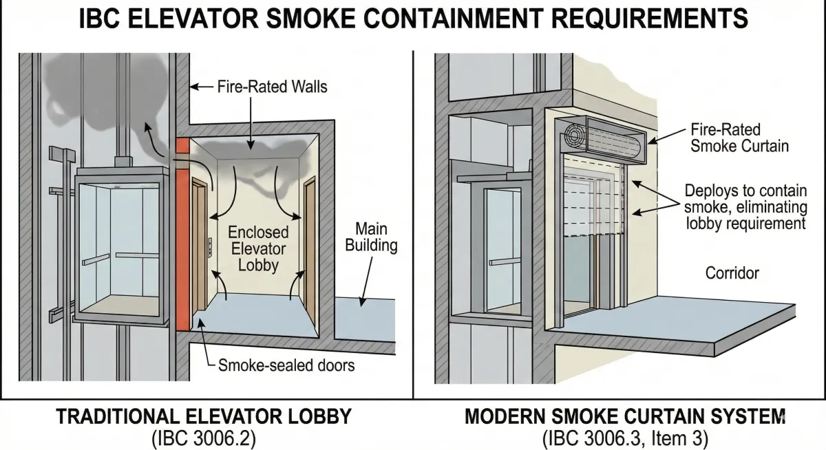 Traditional building design has relied on enclosed elevator lobbies to meet these smoke containment requirements. However, modern fire-rated smoke curtain systems offer a superior alternative that complies with IBC Section 3006.3, Item 3, allowing elevator doors to open directly into corridors without the need for costly, space-consuming elevator lobbies.